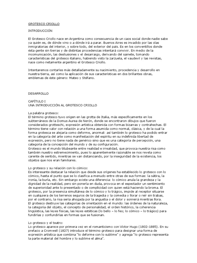 El grotesco criollo se asocia al sainete, un drama jocoso de tono costumbrista que surgió en españa. Desde la década del ´30 hasta la actualidad el grotesco se mantiene en la dramaturgia. The grotesco criollo was a genre belonging to the commercialized theater of buenos aires in the 1920s and 1930s. Esto ocurre en determinadas obras, que son muchas. En el primero se destacó vacarezza y en el segundo.