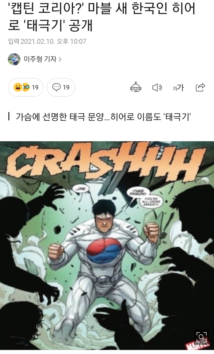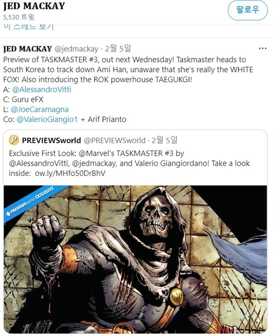 미국 마블 코믹스가 공개한 새 한국인 히어로 '태극기'가 화제다. 미국 만화책 출판사 '마블 코믹스'가 한국인 히어로를 공개해 화제가 되고 있다. 지난 5일 (현지 시간) 마블 코믹스의 프리랜서 작가 제드 맥케이 (jed mackay)는 트위터를 통해 마블 코믹스 태스크마스터 시리즈 3화 소식을 전했다. 자세한 내용은 공개되지 않았지만 히어로 '태극기'의 삽화가 공개되면서 국내 마블 팬들의 기대감이 증폭되고 있다. 미국 마블코믹스가 새 한국인 히어로를 공개한다. 마블 코믹스 팬들 사이에서 '한국판 캡틴 아메리카'라고 불리는 태극기는 근육질 몸에 태극 문양과 건곤감리 4괘가 그려진 흰색 수트를 입었다. 특히 해리 해리스 전 주한미국대사가 최근 외교부 장관 직에서 물러난 강경화 전 장관을 마블의 태극기와 비교해 더욱 주목을 받았었다. 어깨에 건곤감리, 가슴팍에 태극 문양이 그려진 흰색 쫄쫄이 슈트를 입은 이 근육질 남성은 조용히 읊조린다. 2021년 2월 발매한 5부작 단편 타이틀 < 태스크마스터 > #3에서 처음 등장했다. 마블 코믹스에는 루나 스노우(설희), 브론(아마데우스 조), 실크(신디 문), 화이트 폭스(아미 한) 등 한국인 히어로 등이 등장한 바 있다. 현지시간으로 지난 4일, 마블 코믹스 프리랜서 작가인 제드 맥케이가 트위터를 통해 이런 소식을 알렸는데요. 앞서 마블의 프리랜서 작가인 제드 멕케이는 지난 4. 서울 강북구 에서 닉 퓨리 주니어에게 고용된 태스크마스터와 접촉을 한 '청와대를 공격하고 대통령을.
